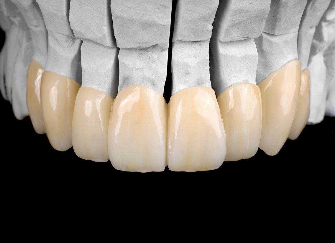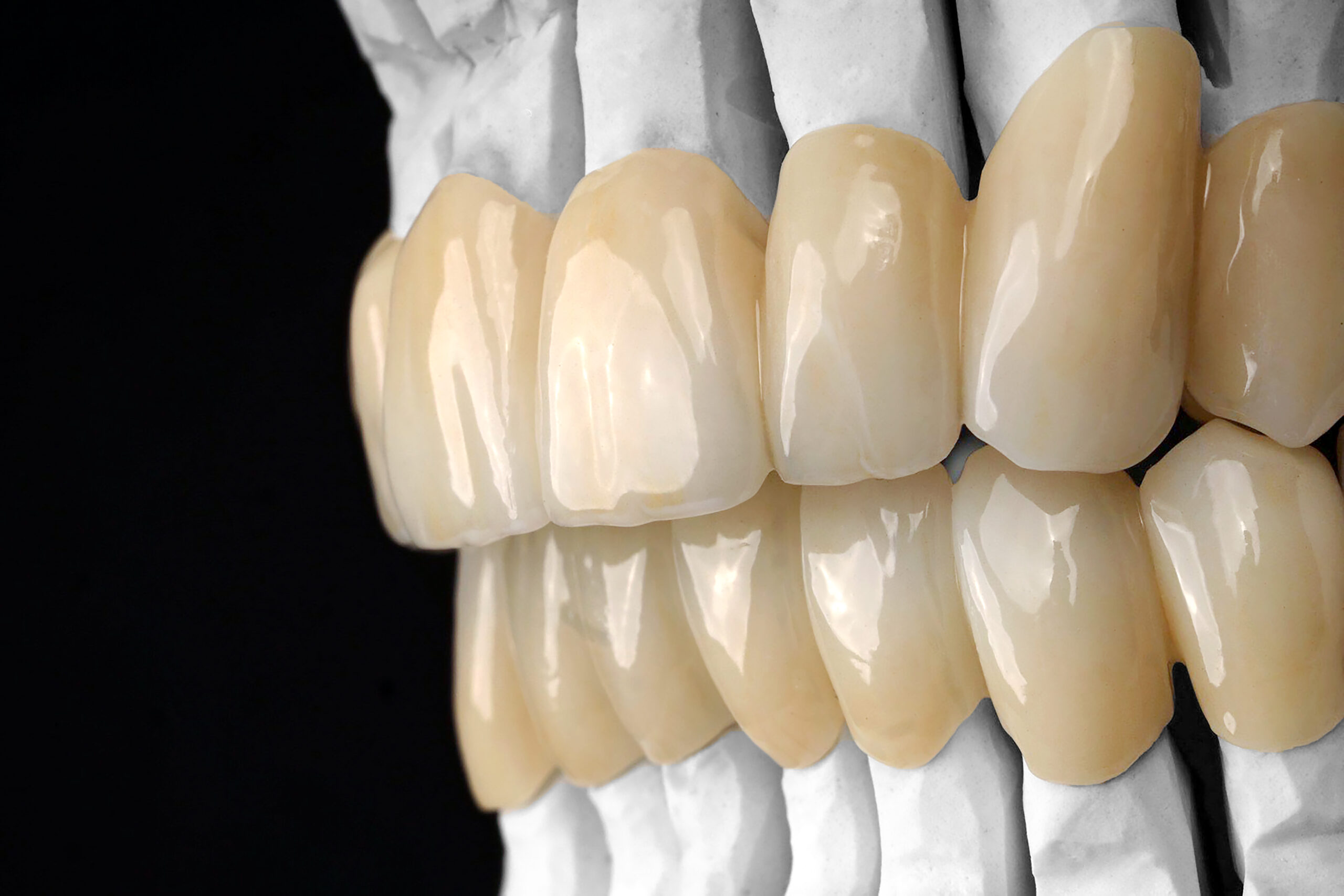 Γέφυρα ζιρκονίου #14-24 και #34-44. Για τον ασθενή, χρησιμοποιήθηκε ζιρκονιο υψηλής φωτοδιάπερατοτητας και αντοχής. Στην συνέχεια προσαρμόσαμε το χρώμα με την χρήση stain για φυσικό και ρεαλιστικό αποτέλεσμα, εξασφαλίζοντας άριστη αισθητική και λειτουργικότητα, παρόλο που ασθενής είναι καπνιστής όπως πληροφορηθήκαμε από τον γιατρό.