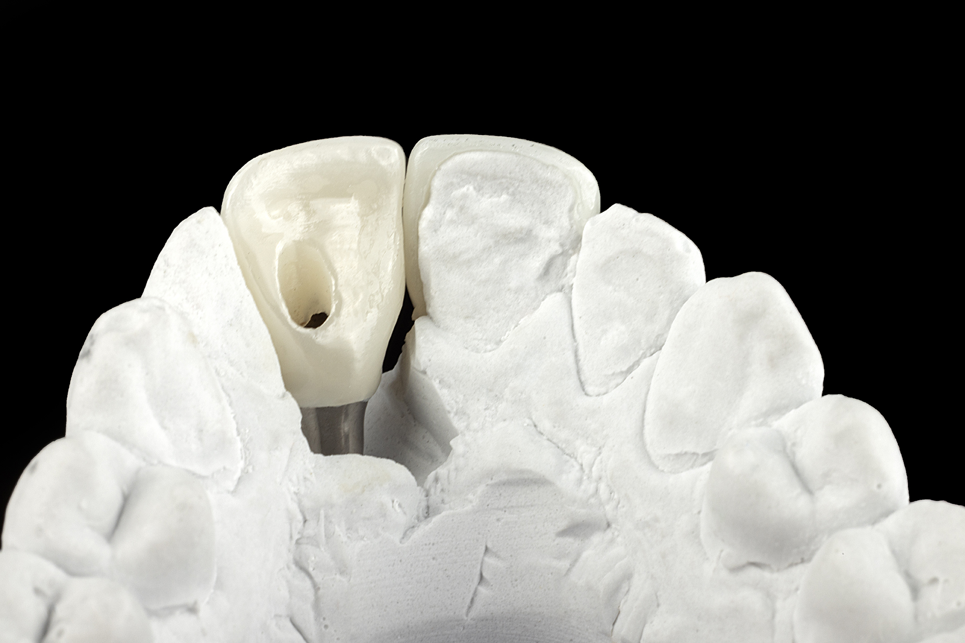 Για τη στήριξή της, δημιουργήθηκε custom dynamic abutment, που μας επέτρεψε να διαμορφώσουμε εξατομικευμένο προφίλ ανάδυσης, εξασφαλίζοντας φυσική στήριξη των μαλακών ιστών, χωρίς παραμορφώσεις, ενώ παράλληλα, στρέψαμε τον αυλό του εμφυτεύματος, ώστε η κοχλίωση να γίνεται από την υπερώια πλευρά, διατηρώντας την αισθητική της αποκατάστασης και διευκολύνοντας την πρόσβαση για τον γιατρό.